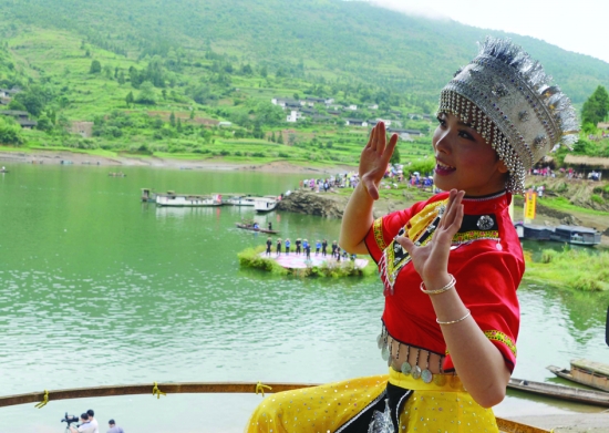 美丽的土家女歌手对着歌从水中荡来。 黄益民 张承印 摄