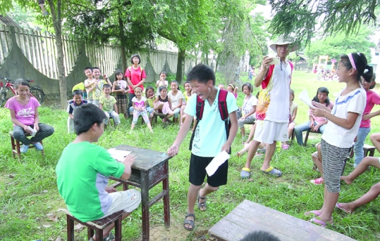 7月11日,太阳很大,大家“躲”在校园里的树阴下,快乐地表演节目。