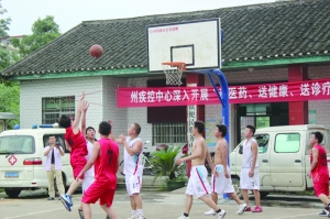 7月12日下午,保靖县复兴镇政府工作人员与州疾控中心工作人员在该镇卫生院开展篮球友谊赛。当日,州疾控中心一行13人来到该镇开展“送医药、送健康、送诊疗”活动。为表达对州疾控中心医疗队的感激之情,义诊结束后,该镇邀请医疗队开展篮球友谊赛,互磋技艺,增进友谊。