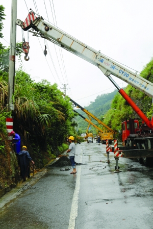 7月17日,工人在吉首市209国道绕城线进行电力施工作业。电力部门组织施工队,对因暴雨导致山体滑坡倒塌的电线杆、线路进行抢修施工,确保居民生产生活正常用电。