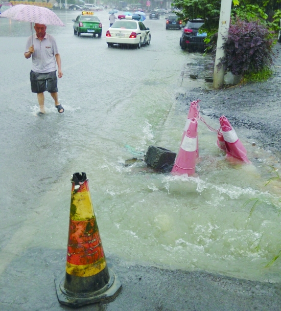 堵塞的下水道使地面水流明显加大,对行人和车辆造成了危害。 欧阳仕君 摄