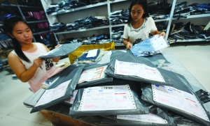 7月25日,在新余市高新区网店一条街,一家服装店工作人员在打包发货。