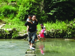 就这样,隆九金成了村里第一个代课教师,依山而建的石头校舍,成了他早出晚归的“家”。几张木板支起的课桌,黄泥巴捶的地面,晴天一身灰,雨天两脚泥。在这简陋的教室里,他手执教鞭,教学生读a、o、e,俯下身子,手把手教学生写1、2、3,履行人民教师的神圣职责。放学后,涨水时节,他必须得把对岸三组的小学生护送下山,一个个背过用两根木头拼成的“棒棒桥”,平安送到家里。