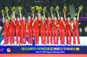 9月12日,中国女排队队员在领奖台上。当日,2014年女排亚洲杯在深圳落幕。在决赛中,中国队以3比0战胜韩国队,夺得冠军。
