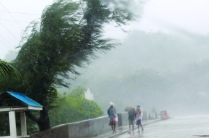 9月20日,在菲律宾北伊罗戈省,人们走在风雨中。