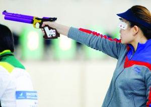 9月20日,中国射击队员郭文珺在比赛中举枪射击。当日,2014年仁川亚运会首块金牌在玉莲国际射击场诞生,郭文珺、张梦圆和周庆媛组成的中国队以1146环的成绩获得冠军,为中国体育代表团赢得本届亚运首金,中华台北队以1141环的成绩获得亚军,韩国队和蒙古队同时打出1140环的成绩,但蒙古队的内十环35次多于韩国队29次,这样蒙古队获得第三,上届冠军韩国队只能获得第四。