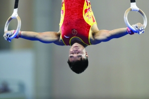 10月11日,中国选手刘洋正在参加男子吊环决赛。当日下午,在广西南宁进行的第四十五届世界体操锦标赛男子吊环决赛中,刘洋以15.933分获得金牌。伦敦奥运冠军扎内蒂以15.733分获得亚军,另一位中国选手尤浩与俄罗斯的阿布里亚金并列季军,成绩是15.700分。 新华社记者 黄孝邦 摄
