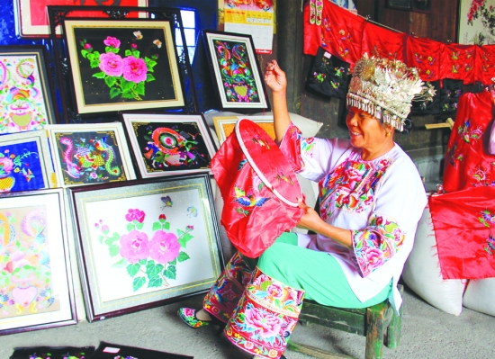 10月15日,花垣县排碧乡十八洞村60多岁的苗族妇女石顺莲正在自家的堂屋刺绣。她原是十八洞村村支书,从村支书的位置上退下来后,她人退心不退,依然想方设法帮助村里发展。