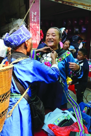 图为杨胜美正在集市上试穿新买的苗族服装。