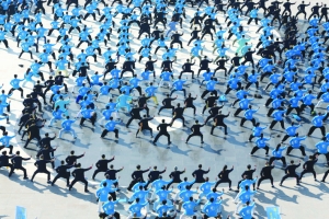 当日,河南省温县陈家沟举行太极拳展演活动。参加为期两天的2014第六届中国陈家沟太极功夫精英赛的880余名国内外太极拳爱好者集体亮相,共舞太极拳。