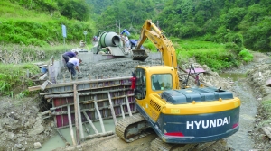 10月23日,施工人员在摊铺保靖县比耳镇利湖村境内一桥梁两头重力混凝土。该村是该县卫生局的建设扶贫村,该村境内有5座县道公路桥梁由于修建时间久远,需改造重建。今年以来,驻村工作组与村支“两委”积极创优桥梁改造环境,成立专门协调服务小组,全力服务改造工程。良好的施工环境,桥梁改造进度比计划加快35%,目前,竣工2座,即将竣工1座。