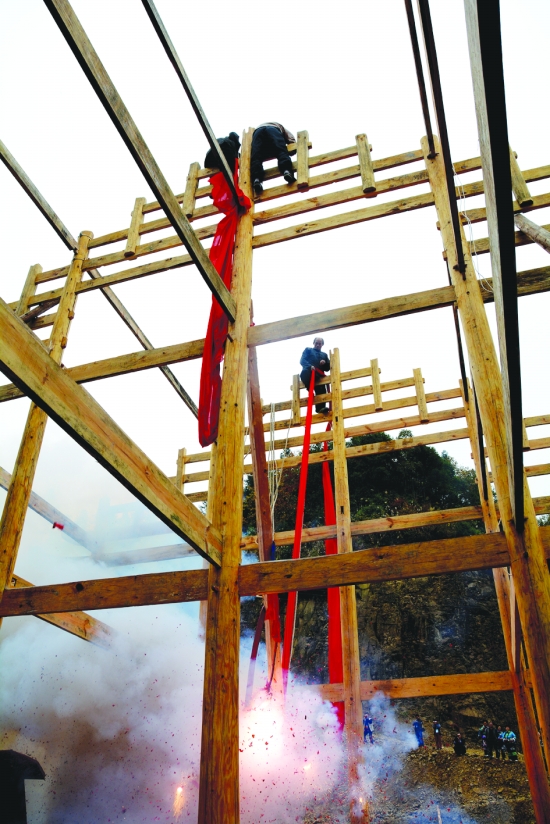 房梁在一阵激烈的鞭炮中冉冉升起。向汉品 摄