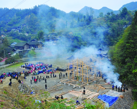 张丁发建新屋上梁,整个村庄喧闹起来。张 谨 摄