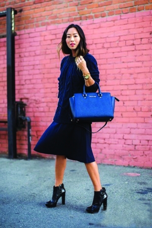 Style 1:及膝裙+短靴 搭配要点:毛衣搭配短裙是今年秋冬很火的一款搭配,及膝长度的裙子搭配粗跟的短靴,露出小腿的肌肤会让你看起来高了好几公分。