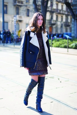 Style 2:迷你裙+长筒靴 搭配要点:不管是连衣裙还是半身迷你裙,最佳的搭配靴款都是长长的中筒靴,露出一部分的大腿肌肤能够让你瞬间显高又显瘦。