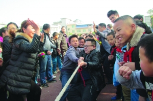 12月5日,龙山县第三小学教师正在开展拔河比赛。当日,该校举行了冬季运动会,近千名师生参加了接力赛、拔河赛等项目的比赛。 田 俊 摄