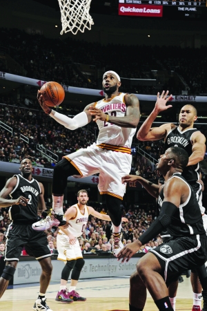 12月20日,骑士队球员詹姆斯在比赛中拉杆上篮。当日,在NBA常规赛中,骑士队迎战篮网队,最终以95比91险胜篮网队。骑士队方面,迈克·米勒三分球8投7中,拿下了21分;勒布朗·詹姆斯18投7中,贡献22分9次助攻;凯里·欧文18投6中,得16分;凯文·勒夫10投仅1中,得6分14个篮板。 (据新华网)