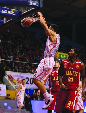 12月19日,广东队球员在比赛中大力扣篮。当日,CBA联赛第二十一轮全面展开,广东队迎战吉林队,最终广东队在主场以116比93战胜对手豪取十连胜。当场比赛,朱芳雨连下“三分雨”,在前三节命中9记三分,全场砍下31分。 (据新华网)