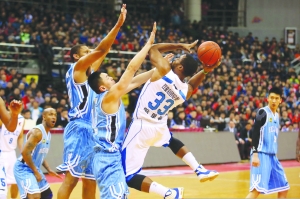 1月2日,青岛队球员哈里斯在篮下高难度投篮。当日,2014-15赛季CBA第27轮赛事全面展开,青岛队主场迎战北京队,哈达迪、邓特蒙、哈里斯三外援合力砍下72分,帮助青岛队以107比86战胜北京队。青岛队送给对手两连败的同时,也坐稳联盟第三的位置。