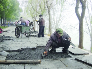 泸溪县白沙镇株洲路的人行道因其毗邻沅江、树木繁茂、风光秀美、设施齐备,当地市民赞誉为“最美小道”。针对人行道部分道板破损,影响平整、美观和市民休闲。连日来,泸溪县住建局组织人员对人行道破损的道板进行修复。图为2014年12月29日,浓浓雾气中,施工人员正在修复破损的人行道板。