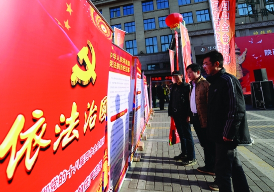 2014年12月4日,西安市民在宪法日宣传活动现场观看依法治国宣传展板。 新华社记者 李一博 摄
