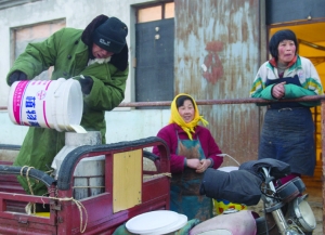 1月10日,在北京市延庆县大榆树下辛庄村村头奶站,工作人员在将一桶鲜奶出售。