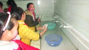 1月6日,龙山县大安乡中心小学学生在学校新建的浴室内开心地接热水洗漱。近日,由北京桂馨慈善基金会帮建的大型空气能热水器系统在该校投入使用,使该校200余名师生冬天能方便使用热水。