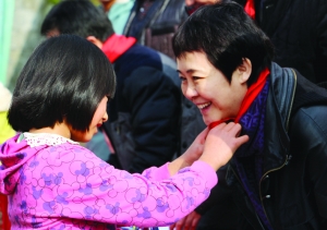 1月7日,傍海村小学的孩子给爱心人士系上红领巾。