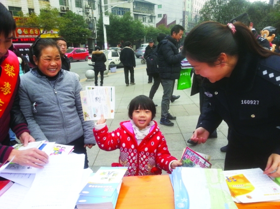 1月10日,吉首步步高广场前坪,小朋友和奶奶从民警手中领取宣传资料。这天是全国第29个“110”宣传日,吉首市公安局民警走上街头,通过摆设展板、发放资料、现场咨询等形式,向市民宣传“110”报警服务和禁毒、防火、防盗、防诈骗等安全知识。 记者 彭 宁 摄