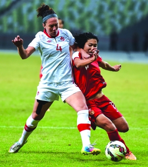 当日,在“宝安杯”2015中国足协深圳国际女足邀请赛最后一场比赛中,中国队在1比0领先的情况下连丢两球,最终以1比2不敌加拿大队。三场比赛1平2负,最终获得第三名。 新华社记者 毛思倩 摄