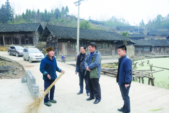 新民村村民张孝英一边清扫门前这条来之不易的硬化路,一边和前来察看通村公路的团结报社社长、总编辑刘世树话家常。 欧阳文章 摄
