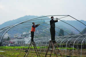 1月15日,永顺县吊井乡大棚蔬菜基地,村民正欣喜地忙着安装不锈钢无支架大棚。近年来,该县不断加大对民生事业的投入,发展优质高效农业和特色农业,积极拓展和打造精品蔬菜基地。据了解,今年中央财政投资50万元、省财政投资20万元,地方自筹资金35万元,为该乡菜农新搭建50个不锈钢无支架大棚,新硬化650米菜地机耕道。