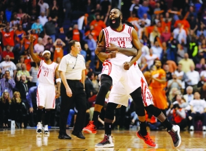 1月24日,火箭队球员哈登在比赛中庆祝进球。当日,NBA常规赛继续进行,休斯顿火箭队客场以113比111险胜菲尼克斯太阳队。“关键先生”哈登在比赛中压哨绝杀太阳队,同时在全场比赛中拿到了33分6篮板10助攻。