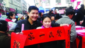 2月6日,古丈县公安局组织擅长书法的民警走上街头,开展“迎新春送春联暨公安政务微信推广宣传”活动。当天,活动现场热闹非凡,书写春联的几张书桌旁都聚满了等待民警挥毫泼墨的男男女女。民警们挥毫泼墨,送出了一句句新春的祝福,很多刚刚写出的新联,墨迹未干,便被急不可耐的群众抢在手中。“没想到你们握枪杆子的,笔杆子也这么里手!”许多群众对民警送春联行为大加赞赏。