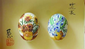 “是的!”关洁坦然地回答,“每天从事葫芦雕刻与创作,一直找不到突破点。想到自己身体里流淌着满族与苗族的血液,这两个民族都有着优秀博大的历史,我如何将这些生命里的元素以我自己喜欢的方式表达出来?一次在家绣花时无意中看到了电视上的蛋雕节目,一不留神,针扎到了手指,当时突然想到怎不试试在蛋上绣花……”