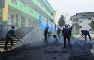 2月11日,花垣县民乐小学里,工人们在硬化校园跑道。确保春节后学生返校有一个更加美丽、舒适、安全的校园环境。