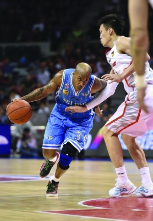 2月27日,北京首钢队球员马布里(左)在比赛中带球进攻。当日,在2014-2015赛季中国男子篮球职业联赛(CBA)季后赛半决赛第二场比赛中,广东东莞银行队主场以96比103不敌北京首钢队。在五局三胜的淘汰赛中,广东东莞银行队总比分0比2落后,已站在被淘汰的悬崖边。