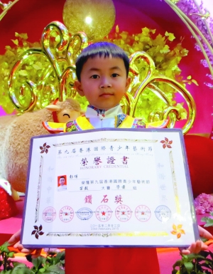由世界华侨华人社团联合会、中华文化五洲行组委会主办的“第九届香港国际青少年艺术节”于2月23日在香港亚洲国际博览馆举行,来自世界四个国家2000多名参赛选手参加了钢琴、舞蹈、声乐、西洋乐、民乐、打击乐、语言表演、书画等项目比赛,湘西小鼓手彭博以较好的发挥获得了这次民乐(打鼓)学前组钻石奖。彭博今年6岁,从小喜欢打鼓,多次参加各类比赛,深受好评。图为彭博捧着组委会颁发的荣誉证书 。