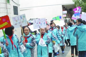 3月4日,在吉首武陵山附近街道上,一群身着“吉首一小”标志校服的孩子沿途捡拾果皮、纸屑、烟头,清理小广告、垃圾箱等公共设施,有的孩子还充当起环卫知识宣讲员,用自制的宣传牌向市民宣传。