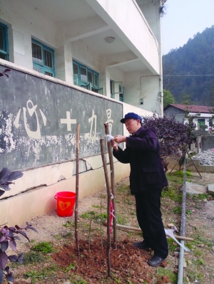 挖坑种树,剪枝浇水,埋土搭架,从本期开学以来,在永顺县三家田小学校园里,有个步态蹒跚的植树者,缓慢但有条不紊地载下一棵棵树苗。据统计,在植树节前的几天内,近80岁的该校退休教师王朝忠独自在校园种下了近30多棵景观树苗。