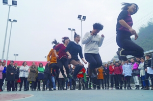 3月13日,凤凰县城区景区管理行政执法局的女职工正在开展跳绳比赛。当日,该局工会组织130余位女职工在该县体育馆举行趣味运动比赛,参赛队员分为5组,每组抽出相等的人数依次参加投篮、抢板凳、拔河、集体跳绳、集体穿呼啦圈等比赛。