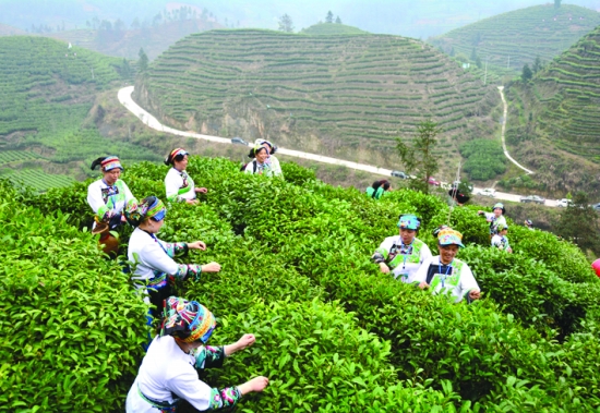 古茶园里新芽冒,苗家阿妹采茶忙。