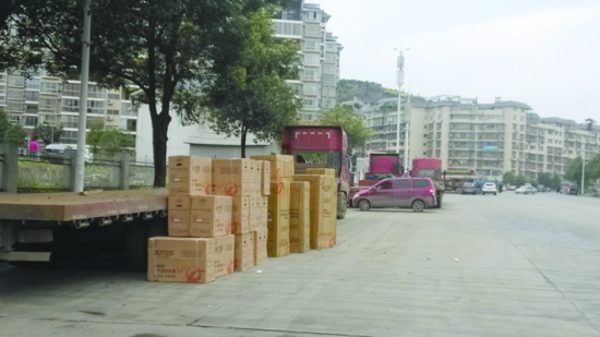 卸下的货物就堆放在车道上。 顾勇兵 摄