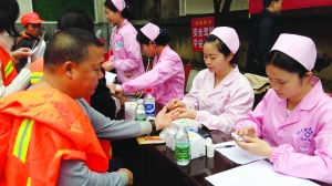 3月27日上午,州民族中医院青年服务队来到吉首市环卫处开展学雷锋活动,免费为环卫工人进行健康检查和健康知识宣传。 记者 杨继东 摄