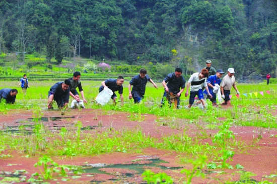 开耕节,田里最热闹,苗族小伙子水田里比赛捉鱼。 龙清彰 摄