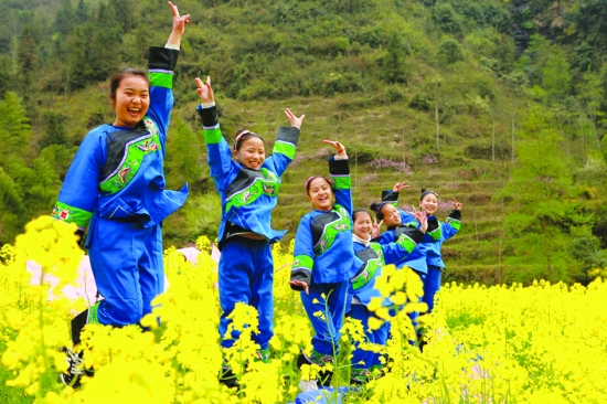 苗族少女在油菜花间欢呼雀跃。 龙清彰 摄