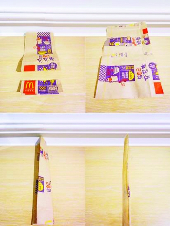 step1 把麦当劳纸袋最下面的双层部分剪去,剪开上面那部分侧面的一条线,横向打开纸袋,纵向对折一分为二,再各自对折一次一分为二,这样就有了四张纸条,再把它们各自对折。