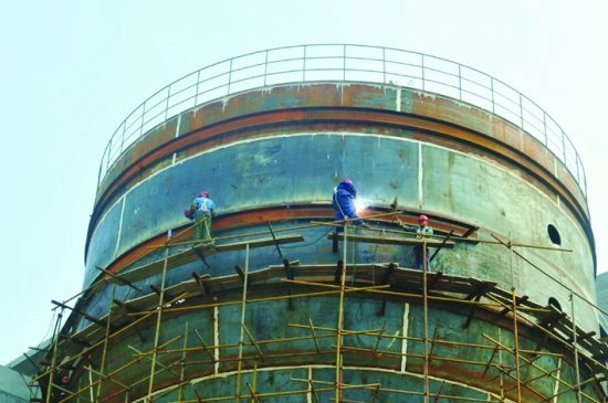 5月21日,保靖县钟灵山工业园区,施工人员系着安全带加固高达20米的硫酸转化器。该转化器是轩华公司12万吨硫酸扩建项目的核心部件。公司负责人告诉记者,轩华公司硫酸扩建项目将力争8月底建成投产。 特约记者 彭司进 摄