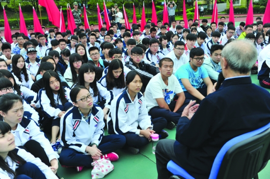学生们听老兵讲述自己在抗美援朝战争中的经历