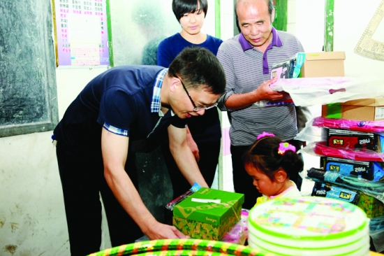 二四五队队长全飞在给孩子发放慰问品。